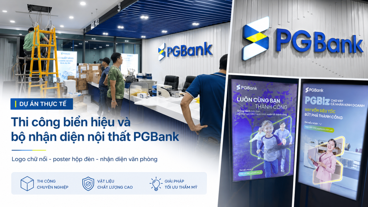 Sau khi hoàn thiện, không gian PGBank trở nên đồng bộ hơn, chuyên nghiệp hơn và có điểm nhấn thương hiệu rõ ràng. Đây là một ví dụ tiêu biểu cho nhóm dịch vụ thi công biển hiệu nội thất, biển công ty, biển phòng ban và nhận diện thương hiệu trong không gian văn phòng.